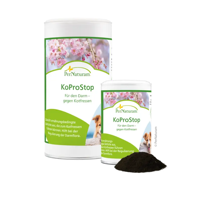 Für den Darm - gegen Kotfressen KoProStop gleicht ernährungsbedingte Defizite aus, die zum Kotfressen führen können. Fütterungsbedingte Defizite und Störungen der Darmbesiedlung, auch durch Antbiotika und andere Medikamente, führen zu Kotfressen. Den Hunden fehlen vor allem Vitamine des B-Komplexes, Vit. K1 und Enzyme. Der Nahrungsbrei im Enddarm enthält diese Stoffe. Der Körper kann sie von hieraus aber nicht mehr ausreichend resorbieren. KroProStop versorgt den Organismus mit diesen notwendigen Stoffen. Moorkonzentrat (Trockenmoor) bindet Schadstoffe im Darm und hilft bei der Regulierung der Darmflora.