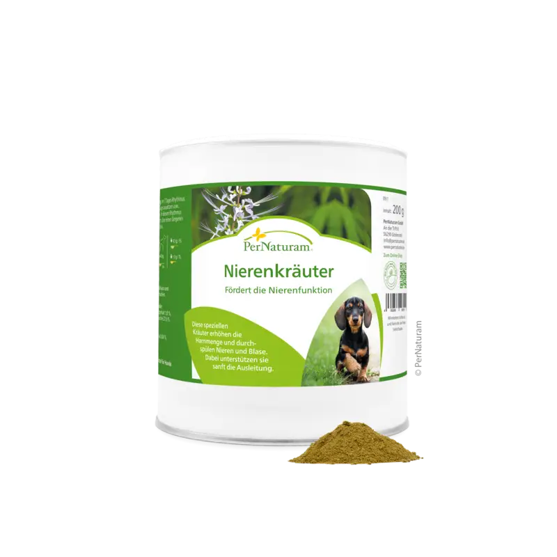 PerNaturam Nieren-Kräuter erhöhen die Harnmenge und durchspülen Nieren und Blase. Sie unter stützen sanft die Ausleitung durch die Niere. Diese speziellen Kräuter wirken besonders gut zusammen mit PerNaturam Bauerngarten grün und können auch über längere Zeit gegeben werden.